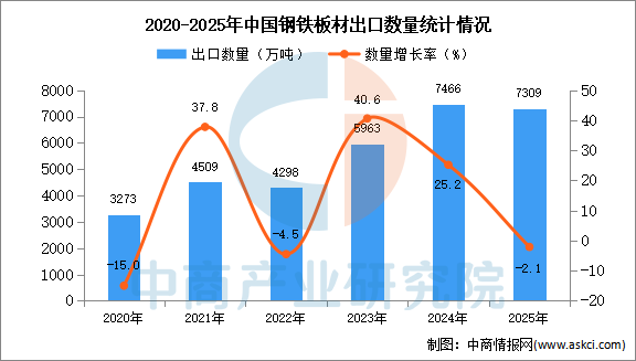 中商情报网讯:据中商产业研究院数据库显示,2024年中国钢铁板材出口量7466万吨,同比增长25.2%。最新数据显示,2025年1-12月中国钢铁板材出口量7309万吨,同比下降2.1%。