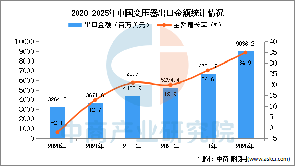 从金额方面来看,数据显示,2025年1-12月中国变压器出口金额9036.2百万美元,同比增长34.9%。
