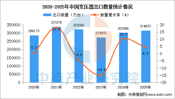 中商情报网讯:据中商产业研究院数据库显示,2024年中国变压器出口量301896万个,同比增长10.3%。最新数据显示,2025年1-12月中国变压器出口量314833万个,同比增长4.3%。