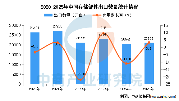 中商情报网讯:据中商产业研究院数据库显示,2024年中国存储部件出口量20541万台,同比下降11%。最新数据显示,2025年1-12月中国存储部件出口量21144万台,同比增长3.3%。