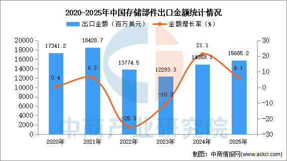 从金额方面来看,数据显示,2025年1-12月中国存储部件出口金额15685.2百万美元,同比增长6.1%。