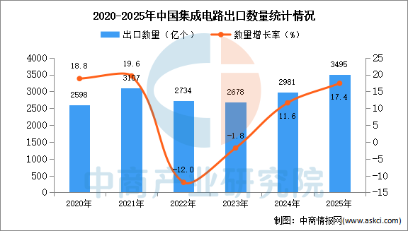 中商情报网讯:据中商产业研究院数据库显示,2024年中国集成电路出口量2981亿个,同比增长11.6%。最新数据显示,2025年1-12月中国集成电路出口量3495亿个,同比增长17.4%。