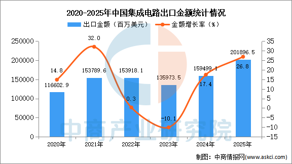 从金额方面来看,数据显示,2025年1-12月中国集成电路出口金额201896.5百万美元,同比增长26.8%。