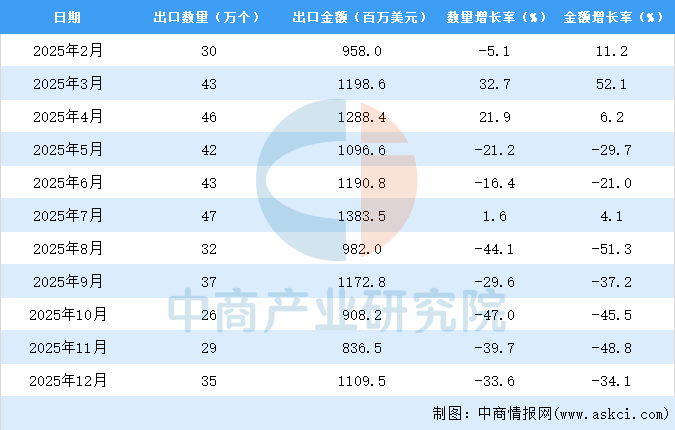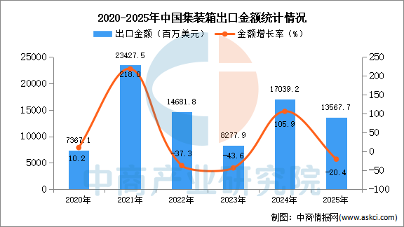 从金额方面来看,数据显示,2025年1-12月中国集装箱出口金额13567.7百万美元,同比下降20.4%。