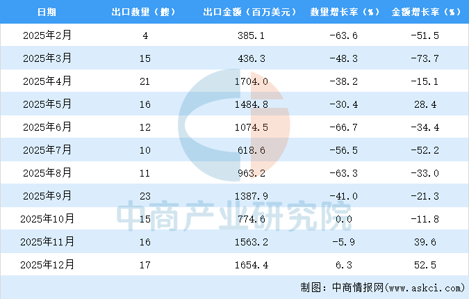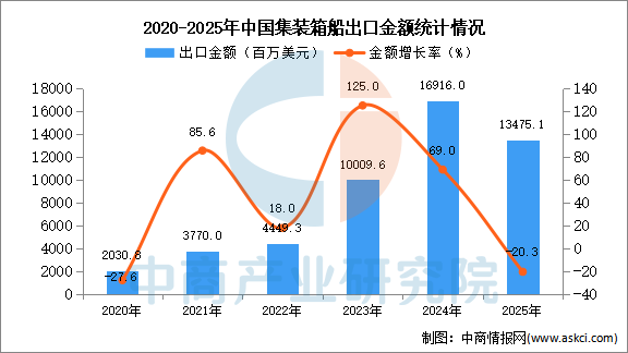 从金额方面来看,数据显示,2025年1-12月中国集装箱船出口金额13475.1百万美元,同比下降20.3%。