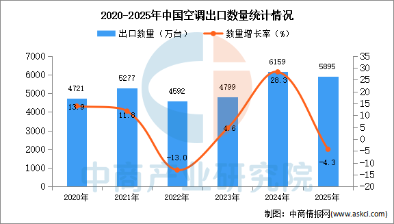 中商情报网讯:据中商产业研究院数据库显示,2024年中国空调出口量6159万台,同比增长28.3%。最新数据显示,2025年1-12月中国空调出口量5895万台,同比下降4.3%。