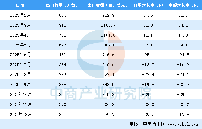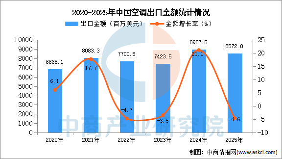 从金额方面来看,数据显示,2025年1-12月中国空调出口金额8572百万美元,同比下降4.6%。