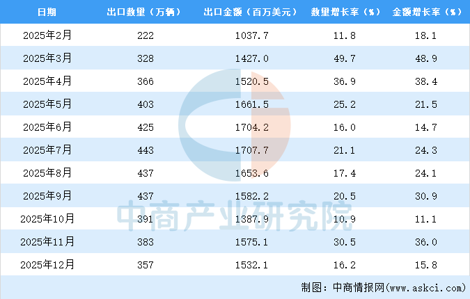 2025年12月中国摩托车出口量及金额增长情况