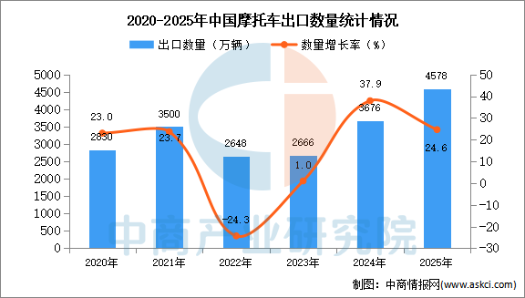 中商情报网讯:据中商产业研究院数据库显示,2024年中国摩托车出口量3676万辆,同比增长37.9%。最新数据显示,2025年1-12月中国摩托车出口量4578万辆,同比增长24.6%。