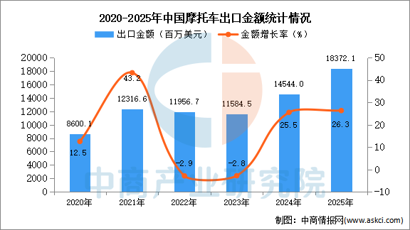 从金额方面来看,数据显示,2025年1-12月中国摩托车出口金额18372.1百万美元,同比增长26.3%。