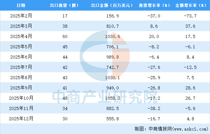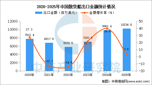 从金额方面来看,数据显示,2025年1-12月中国散货船出口金额10236.8百万美元,同比增长3.6%