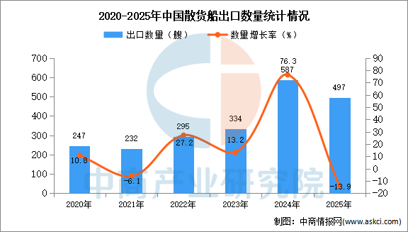 中商情报网讯:据中商产业研究院数据库显示,2024年中国散货船出口量587艘,同比增长76.3%。最新数据显示,2025年1-12月中国散货船出口量497艘,同比下降13.9%。