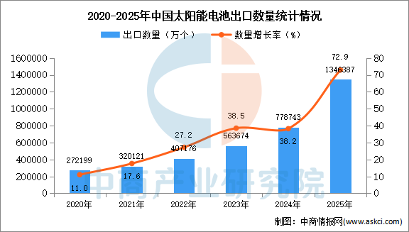 中商情报网讯:据中商产业研究院数据库显示,2024年中国太阳能电池出口量778743万个,同比增长38.2%。最新数据显示,2025年1-12月中国太阳能电池出口量1346387万个,同比增长72.9%。