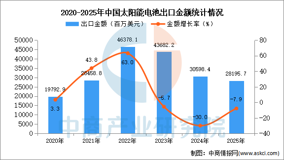 从金额方面来看,数据显示,2025年1-12月中国太阳能电池出口金额28195.7百万美元,同比下降7.9%。