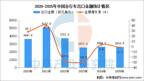 从金额方面来看,数据显示,2025年1-12月中国自行车出口金额2616.9百万美元,同比下降1.7%。