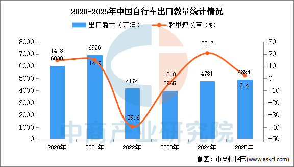 中商情报网讯:据中商产业研究院数据库显示,2024年中国自行车出口量4781万辆,同比增长20.7%。最新数据显示,2025年1-12月中国自行车出口量4894万辆,同比增长2.4%。