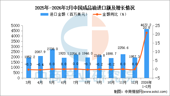 从金额方面来看,2026年1-2月中国成品油进口金额4672.2百万美元,同比增长20.8%。
