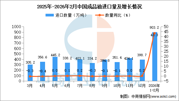中商情报网讯:据中商产业研究院数据库显示,2026年1-2月中国成品油进口量903.2万吨,同比增长43.3%。