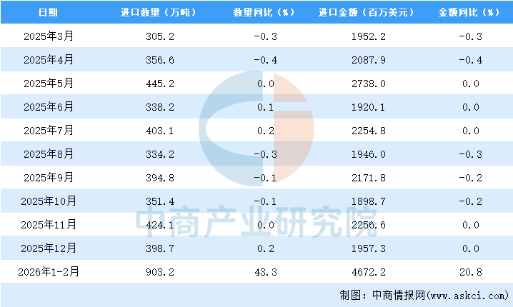 2026年1-2月中国成品油进口量及金额增长情况