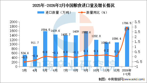 中商情报网讯:据中商产业研究院数据库显示,2026年1-2月中国粮食进口量1786.5万吨,同比增长2.9%;1-2月中国粮食进口量1786.5万吨,同比增长2.9%。