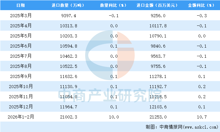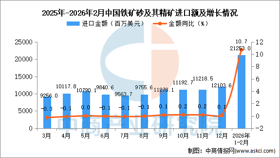 从金额方面来看,2026年1-2月中国铁矿砂及其精矿进口金额21253百万美元,同比增长10.7%;1-2月中国铁矿砂及其精矿进口金额21253百万美元,同比增长10.7%。