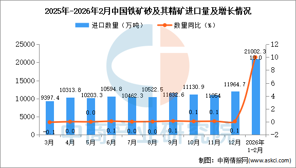 中商情报网讯:据中商产业研究院数据库显示,2026年1-2月中国铁矿砂及其精矿进口量21002.3万吨,同比增长10%;1-2月中国铁矿砂及其精矿进口量21002.3万吨,同比增长10%。