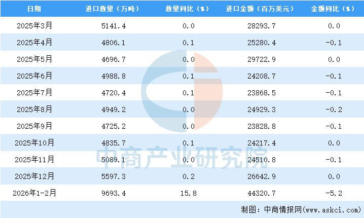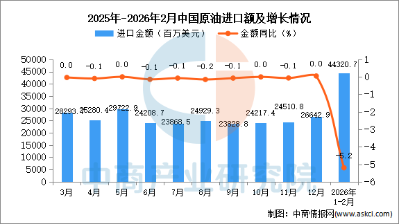 从金额方面来看,2026年1-2月中国原油进口金额44320.7百万美元,同比下降5.2%;1-2月中国原油进口金额44320.7百万美元,同比下降5.2%。