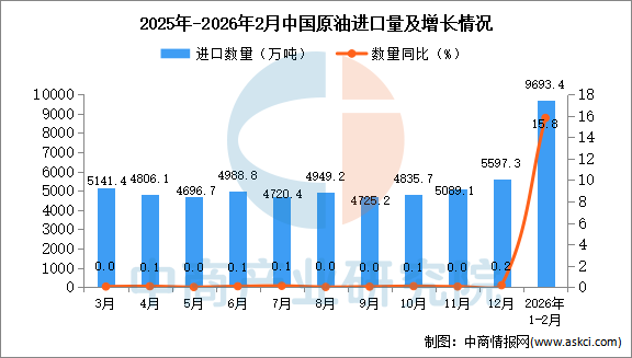 中商情报网讯:据中商产业研究院数据库显示,2026年1-2月中国原油进口量9693.4万吨,同比增长15.8%;1-2月中国原油进口量9693.4万吨,同比增长15.8%。