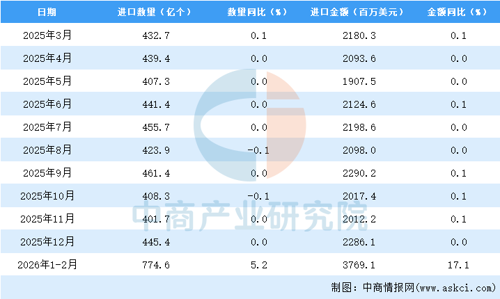 中商情报网讯:据中商产业研究院数据库显示,2026年1-2月中国二极管及类似半导体器件进口量774.6亿个,同比增长5.2%;1-2月中国二极管及类似半导体器件进口量774.6亿个,同比增长5.2%。