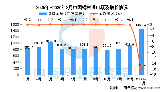 从金额方面来看,2026年1-2月中国钢材进口金额1463.4百万美元,同比下降16.4%;1-2月中国钢材进口金额1463.4百万美元,同比下降16.4%。
