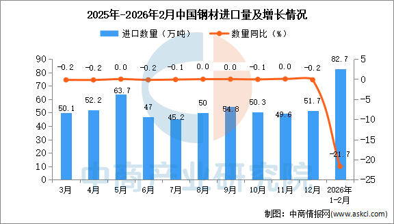 中商情报网讯:据中商产业研究院数据库显示,2026年1-2月中国钢材进口量82.7万吨,同比下降21.7%;1-2月中国钢材进口量82.7万吨,同比下降21.7%。