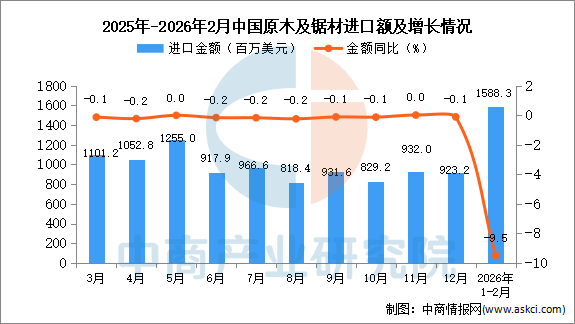 从金额方面来看,2026年1-2月中国原木及锯材进口金额1588.3百万美元,同比下降9.5%;1-2月中国原木及锯材进口金额1588.3百万美元,同比下降9.5%。