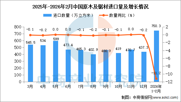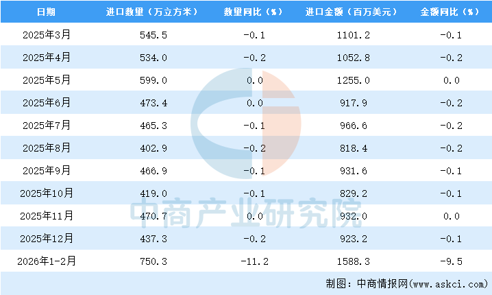 中商情报网讯:据中商产业研究院数据库显示,2026年1-2月中国原木及锯材进口量750.3万立方米,同比下降11.2%;1-2月中国原木及锯材进口量750.3万立方米,同比下降11.2%。