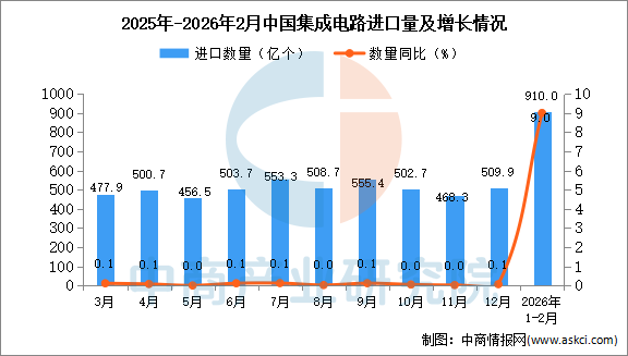 中商情报网讯:据中商产业研究院数据库显示,2026年1-2月中国集成电路进口量910亿个,同比增长9%;1-2月中国集成电路进口量910亿个,同比增长9%。