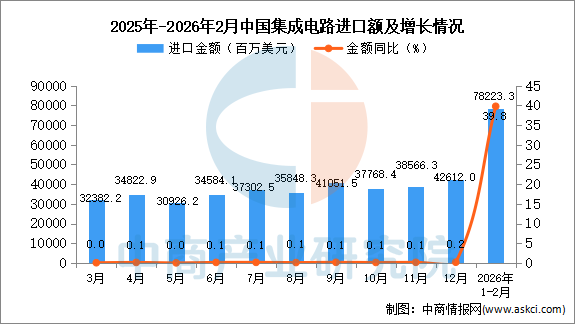 从金额方面来看,2026年1-2月中国集成电路进口金额78223.3百万美元,同比增长39.8%;1-2月中国集成电路进口金额78223.3百万美元,同比增长39.8%。