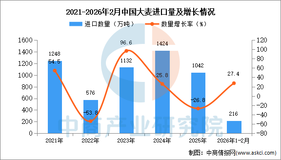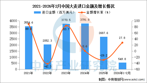2026年2月中国大麦进口量及金额增长情况
