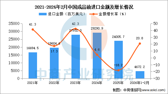 从金额方面来看,数据显示,2026年1-2月中国成品油进口金额4672.2百万美元,同比增长20.8%。