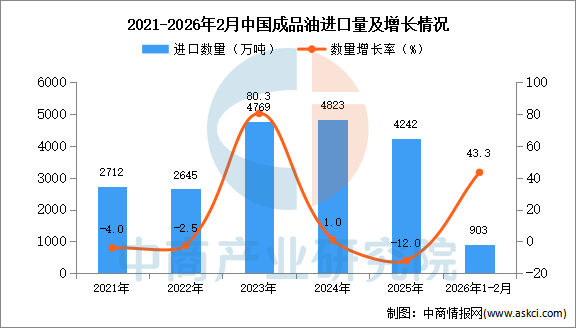 中商情报网讯:据中商产业研究院数据库显示,2025年中国成品油进口量4242万吨,同比下降12%。最新数据显示,2026年1-2月中国成品油进口量903万吨,同比增长43.3%。