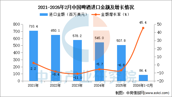 从金额方面来看,数据显示,2026年1-2月中国啤酒进口金额86.4百万美元,同比增长45.4%。