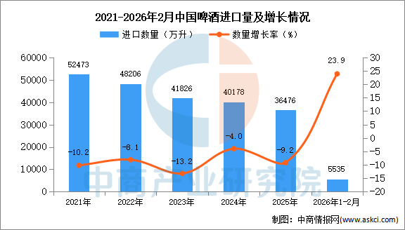 中商情报网讯:据中商产业研究院数据库显示,近几年,我国啤酒进口量呈下降趋势,2025年中国啤酒进口量36476万升,同比下降9.2%。最新数据显示,2026年1-2月中国啤酒进口量5535万升,同比增长23.9%。