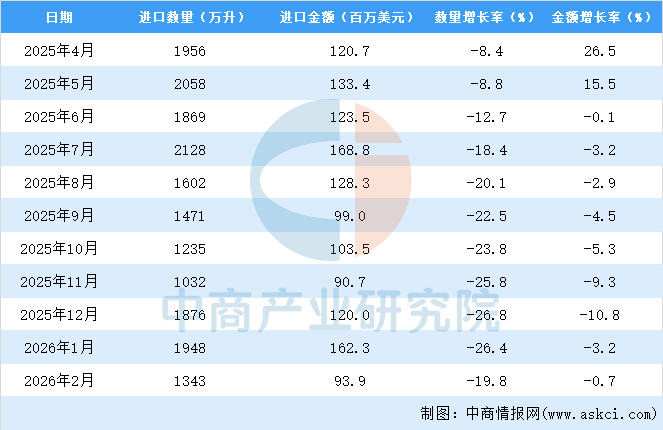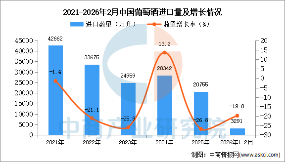 中商情报网讯:据中商产业研究院数据库显示,近几年,我国葡萄酒进口量呈下降趋势,2025年中国葡萄酒进口量20755万升,同比下降26.8%。最新数据显示,2026年1-2月中国葡萄酒进口量3291万升,同比下降19.8%。