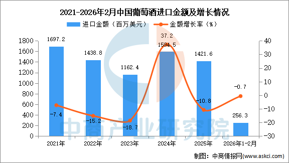 从金额方面来看,数据显示,2026年1-2月中国葡萄酒进口金额256.3百万美元,同比下降0.7%。