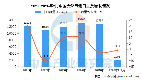 中商情报网讯:据中商产业研究院数据库显示,2025年中国天然气进口量12787万吨,同比下降2.8%。最新数据显示,2026年1-2月我国天然气累计进口量2002万吨,同比下降1.1%。