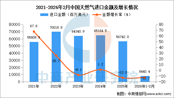 2026年2月中国天然气进口量及金额增长情况