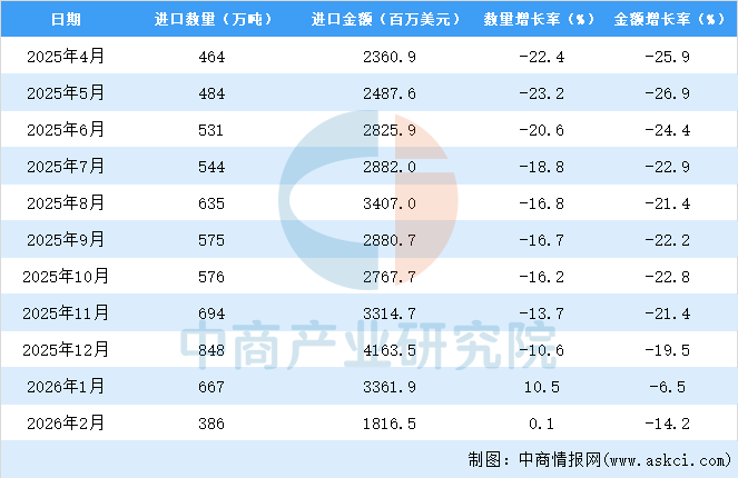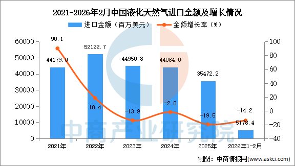 从金额方面来看,数据显示,2026年1-2月中国液化天然气进口金额5178.4百万美元,同比下降14.2%。