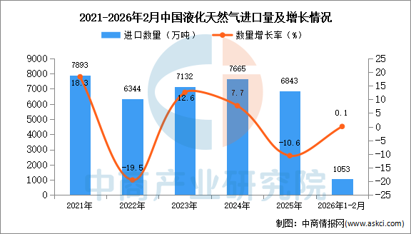 中商情报网讯:据中商产业研究院数据库显示,2025年中国液化天然气进口量6843万吨,同比下降10.6%。最新数据显示,2026年1-2月中国液化天然气进口量1053万吨,同比增长0.1%。