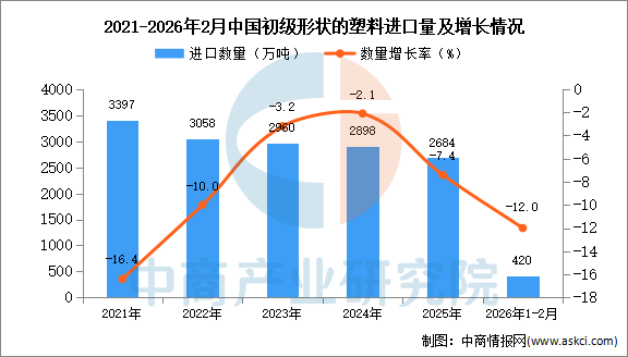 中商情报网讯:据中商产业研究院数据库显示,2025年中国初级形状的塑料进口量2684万吨,同比下降7.4%。最新数据显示,2026年1-2月我国初级形状的塑料累计进口量420万吨,同比下降12%。