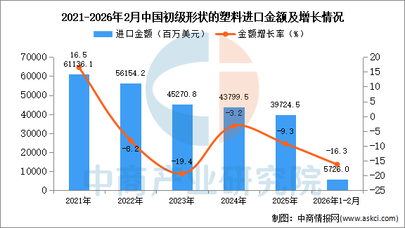 从金额方面来看,数据显示,2026年1-2月我国初级形状的塑料累计进口金额39724.5百万美元,同比下降9.3%。
