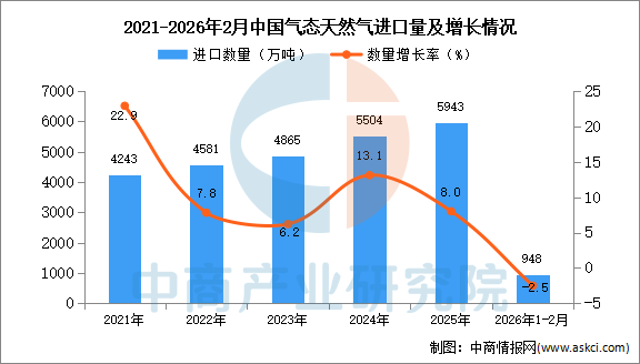 中商情报网讯:据中商产业研究院数据库显示,2025年中国气态天然气进口量5943万吨,同比增长8%。最新数据显示,2026年1-2月中国气态天然气进口量948万吨,同比下降2.5%。