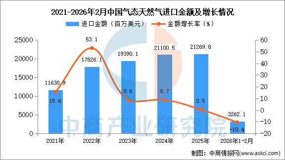从金额方面来看,数据显示,2026年1-2月中国气态天然气进口金额3262.1百万美元,同比下降10.4%。
